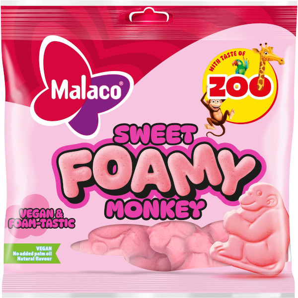 Malaco Sweet Foamy Monkey är luftiga, mjuka skumgodisapor med smaken av klassiska Zoo-godis – söta, lätta och veganska utan palmoljetillsats. Roliga att äta, ännu roligare att inte dela med sig av. 🐒🩷