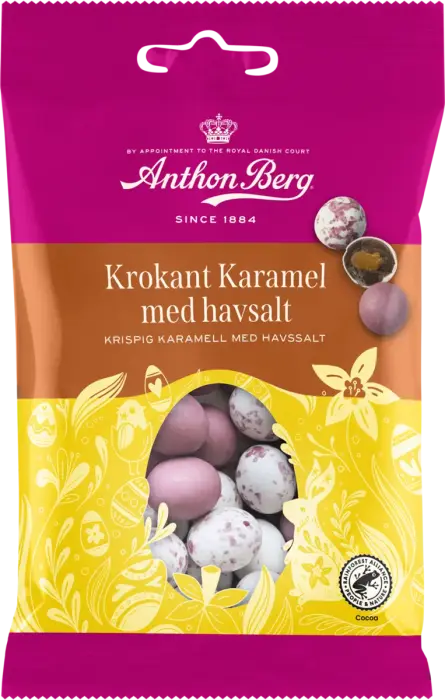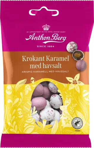 Anthon Berg Krokant Karamel med Havssalt är påskäggen som kombinerar allt gott! Chokladdragerade ägg fyllda med krispig krokant, krämig karamell och en touch havssalt - perfekt balans mellan knastrigt, sött och salt. Varje ägg är en liten smakexplosion som gör dem omöjliga att sluta äta. Perfekt till påsken, som present eller när du vill unna dig något riktigt lyxigt!