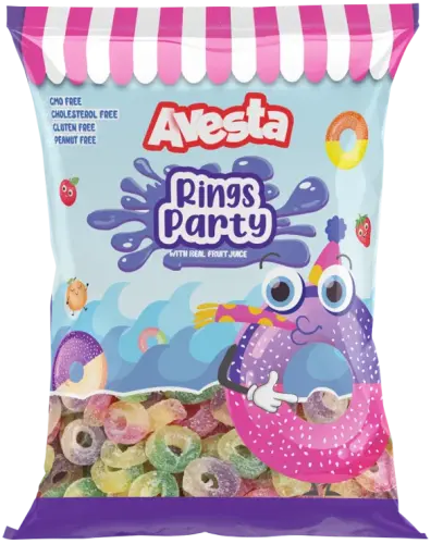 Avesta Rings Party är godisfesten för barn som älskar ringar! Färgglada fruktgummiringar i olika smaker täckta med lätt socker - perfekta att trä på fingrarna före man äter dem (vi vet att alla gör så!). Söta, fruktig och festliga med den där sockriga ytan som gör dem extra goda. Perfekt till barnkalas, som fredag-godis eller när man bara vill känna sig festlig!