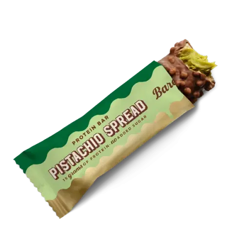MJÖLKPROTEINER, sötningsmedel (maltitol), fuktighetsbevarande medel (glycerol), kollagenhydrolysat, polydextros, kakaosmör, HELMJÖLKSPULVER, PISTAGEPASTA, SOJAPROTEIN, vatten, kakaomassa, solrosolja, salt, aromer, färgande livsmedel (koncentrat av gurkmeja, spirulina, äpple), emulgeringsmedel (lecitin), sötningsmedel (sukralos). Kan innehålla spår av SPANNMÅL SOM INNEHÅLLER GLUTEN, JORDNÖTTER och andra NÖTTER.