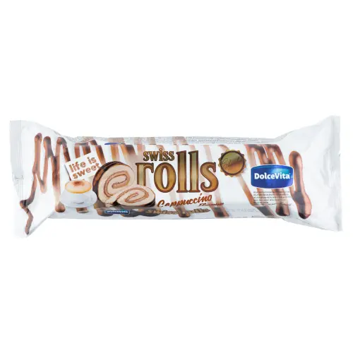 Rulltårta med cappuccino! DolceVita Swiss Rolls Cappuccino är den mjuka rullkakan med cappuccinokräm och chokladöverdrag. Luftig kakrulle fylld med krämig cappuccinofyllning täckt i choklad - perfekt balans mellan kaffe och chokladigt. Perfekt som mellanmål eller till kaffet! ☕🍫