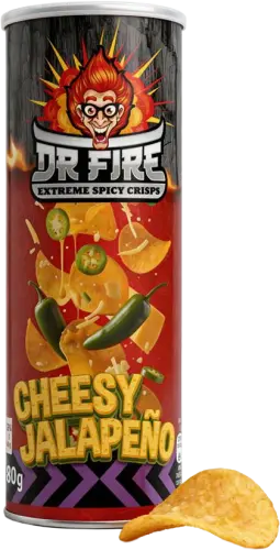 Ostigt och eldigt! Dr Fire Extreme Spicy Crisps Cheesy Jalapeño är chips som kombinerar krämig ost med het jalapeño-kick. Perfekt balans mellan cheesy-goodness och chili-hetta som gör dem beroendeframkallande. För dig som älskar både ost och stark mat, eller vill ha något lite mer sofistikerat än vanlig cheesechips. Osten möter hettan! 🧀🌶️