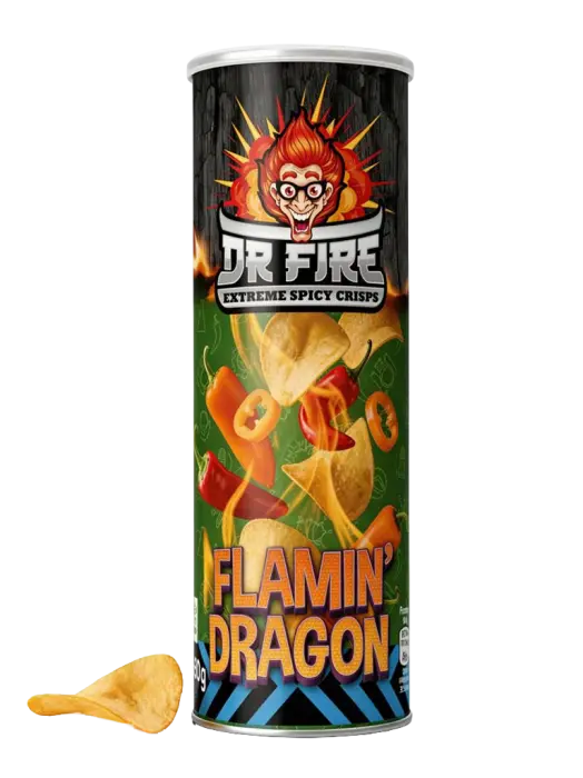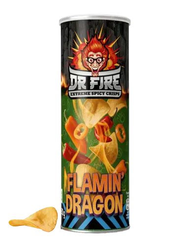 Drakens andedräkt i chipsform! Dr Fire Extreme Spicy Crisps Flamin' Dragon är chips för den modiga - extremt heta och kryddiga med drakens egen hetta. Krispiga chips som bränner från första tuggan och inte släpper taget. Perfekt för dig som älskar het-utmaningar eller vill impa på kompisarna med din tolerans. Varning: detta är ingen lek! 🐉