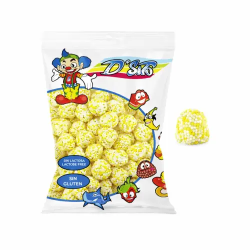 Banan i björnbärsform! D'Sito Blackberries Banana är gelégodiset format som björnbär med mjuk banangelé inuti täckt med pärlsocker. Mjuka, söta och gula - laktosfria och glutenfria. Perfekt till kalas och fester! 🍌💛