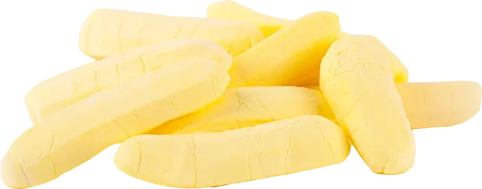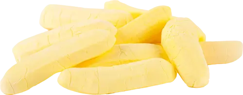 socker, glukos-fruktossirap, vatten, gelatin, fuktighetsbevarande medel (sorbitol), surhetsreglerande medel (citronsyra), bananarom, färgämne (E100). Näringsinformation: Per 100g. Energi: 1379kJ / 326kcal / Fett: 0.0g / Varav mättat fett: 0.0g / Kolhydrater: 77.9g / Varav sockerarter: 66.2g / Fiber: 0.0g / Protein: 5.7g / Salt: 0.0g.