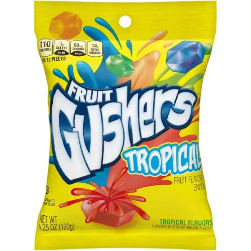Gushers Tropical är de ikoniska amerikanska fruktgodisarna med flytande fyllning som sprutar ut vid första tuggan – tropiska smaker i ett mjukt, tuggigt skal som exploderар av fruktighet. En klassiker sedan 90-talet som fortfarande överraskar. 🌴💥
