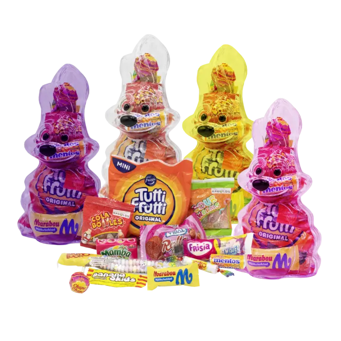 Påskkaninen fylld med godissurpriser! Denna färgglada plastkanin är full av populära godismärken - Marabou mjölkchoklad, Mentos, Tutti Frutti, Mamba, Sour Worms, Cola Bottles och mycket mer. Perfekt påskpresent för barn och vuxna som älskar godis. Färgen väljs slumpmässigt - lila, transparent, gul eller rosa. Vad mer kan man önska sig i påsk? 🐰🍬