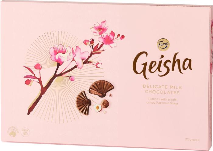 Geisha är en härlig klassiker från Fazer som nästan alla känner till. Nu finns Geisha Chokladpraliner - en ask med solfjäderformade praliner. De har ett sammetslent mjölkchokladöverdrag och en krispig fyllning av hasselnötsnougat. Och bäst av allt: alla Fazers goda chokladprodukter tillverkas av 100 % ansvarsfullt producerad kakao. Ta en paus och avnjut en pralin eller två. Den vackra Geisha-asken är också en perfekt present.