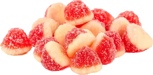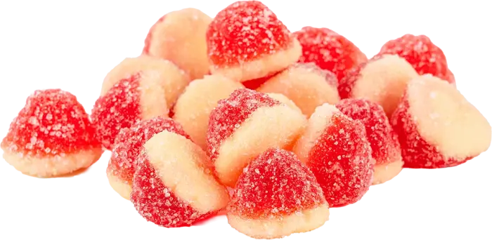 Socker, glukos/fruktossirap, vatten, gelatin, surhetsreglerande medel (äppelsyra), arom, färgämne (E120). Näringsinformation: Per 100g. Energi: 1502kJ / Fett: 0.1g / Varav mättat fett: 0.1g / Kolhydrater: 79.0g / Varav sockerarter: 59.0g / Protein: 9.3g / Salt: 0.0g.