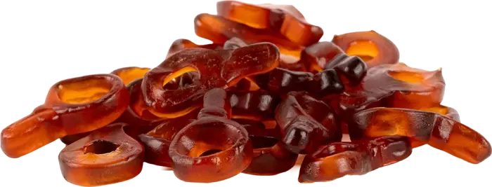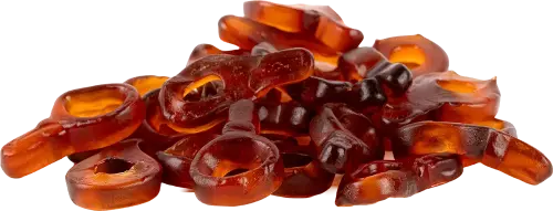 Glukossirap; socker; gelatin; druvsocker; syra: citronsyra; karamelliserat socker; arom; solrosolja; palmolja; ytbehandlingsmedel: bivax vitt och gult, karnaubavax. Näringsinformation: Per 100g. Energi: 1459kJ / 343kcal / Fett: <0.5g / Varav mättat fett: 0.1g / Kolhydrater: 77g / Varav sockerarter: 46g / Protein: 6.9g / Salt: 0.07g.