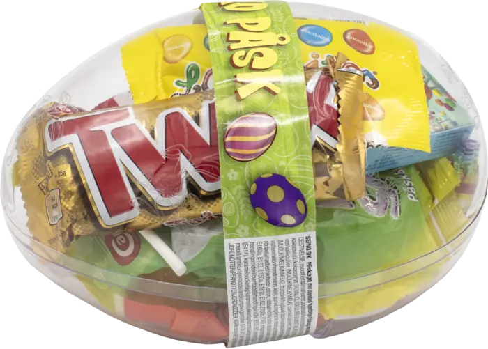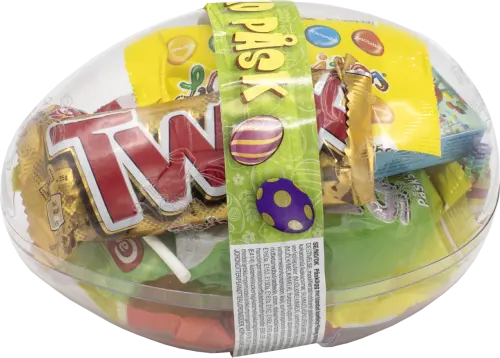 Påskägget fullt av godisöverraskningar! Detta genomskinliga plastägg är fyllt med populära godisbitar - Twix, Lacasitos och mycket mer pärlande gott. Perfekt påskpresent för barn och vuxna som älskar att öppna något och inte veta vad som gömmer sig inuti. Mer spännande än ett vanligt chokladägg - här får du ett helt godisäventyr! 🐣🍬