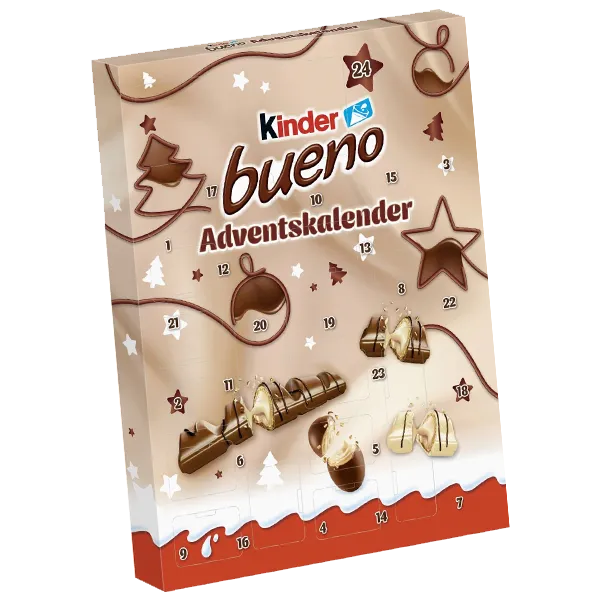 Kinder Bueno är något alldeles unikt, man kan helt enkelt inte få nog av den fantastiskt krämiga mjölk- och hasselnötsfyllning, det krispiga kexet och det lena mjölkchokladsöverdraget. Så gör nedräkningen till årets bästa dag, julafton, lite enklare och roligare, för dig eller någon du uppskattar.