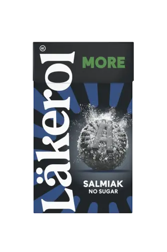 Salmiak med MORE! Läkerol MORE Salmiak är den moderna pastillen med mer av allt - tjockare, mjukare och lättare att tugga. Intensiv salmiaksmak förstärkt med ett lätt xylitollager, sockerfri och vegansk. Praktisk liten ask som är lätt att ta med för att stilla salmiakbegäret och förgylla stunden! 🖤