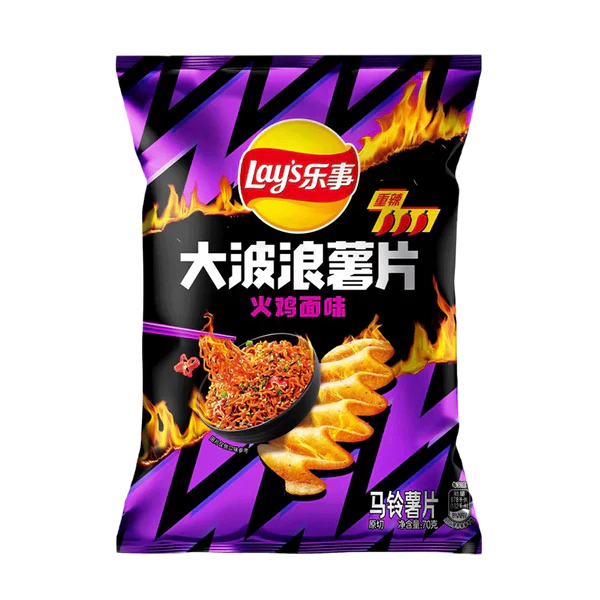 Lay's Big Wave Hot Chicken Noodle är krispiga vågchips med smaken av het kycklingnudelsoppa – kryddstark, umamiring och med den där karakteristiska nudelsoppekänslan i varje chip. Stor smak, stor våg, stort tugg. 🍜🌶️