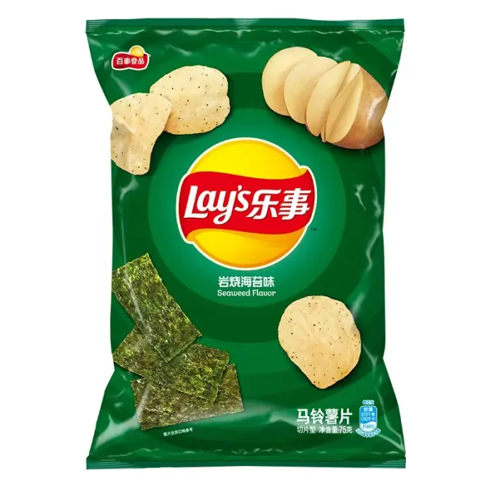 Lay's Seaweed är den kinesiska varianten med smak av rostad tång – umamiring, salt och med en distinkt havskänsla i varje chip. Krispiga potatischips med en djup, asiatisk smakprofil som tar snackset till en helt annan nivå. 🌊🥬