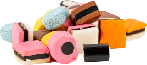socker, glukossirap, melass, VETEMJÖL, glukos-fruktossirap, fullhärdat kokosfett, kokosflingor, lakritsextrakt, fuktighetsbevarande medel (sorbitoler, glycerol), gelatin, VETESTÄRKELSE, invertsockersirap, färgämnen (E150c, E153, E120, E160e, E160a), kakaopulver, salt, vatten, emulgeringsmedel (E471), naturliga aromer (bl.a. vanillin), koncentrat från (spirulina), vegetabiliska oljor (kokos, raps), ytbehandlingsmedel (bivax), antioxidant (askorbinsyra), kokosfett. Blandningsförhållandet kan variera. Näringsinformation: Per 100g. Energi: 1529kJ / 361kcal / Fett: 3.0g / Varav mättat fett: 2.7g / Kolhydrater: 79g / Varav sockerarter: 62g / Protein: 2.9g / Salt: 0.22g.