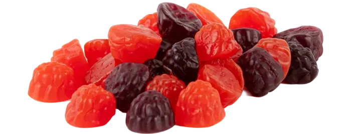 socker, glukossirap, glukos-fruktossirap, stärkelse, syra (citronsyra), surhetsreglerande medel (natriumcitrat), koncentrat från svart morot, vegetabiliska oljor (kokos, raps), aromer, ytbehandlingsmedel (bivax), färgämne (E160e). Näringsinformation: Per 100g. Energi: 1474kJ / 347kcal / Fett: 0.2g / Varav mättat fett: 0.2g / Kolhydrater: 85g / Varav sockerarter: 65g / Protein: 0g / Salt: 0.25g.