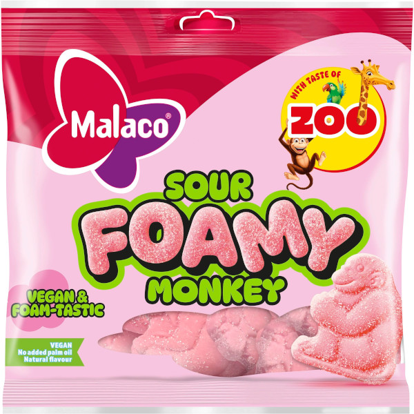 Malaco Sour Foamy Monkey är luftiga, mjuka skumgodisapor med syrligt socker på utsidan och klassisk Zoo-smak inuti – söta, syrliga, veganska och utan palmoljetillsats. Precis som den söta varianten fast med lite mer attityd. 🐒
