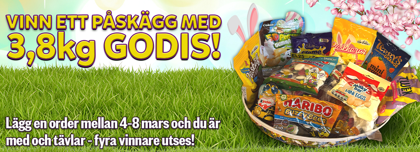 Mellan 4–8 mars har du chansen att vinna ett riktigt drömpåskägg fyllt med hela 3,8 kg godis! Alla som lägger en order under kampanjperioden är automatiskt med i utlottningen. Vi drar fyra lyckliga vinnare bland samtliga beställningar – så passa på att fylla på lagret och samtidigt få chansen att vinna något riktigt sött till påsk!