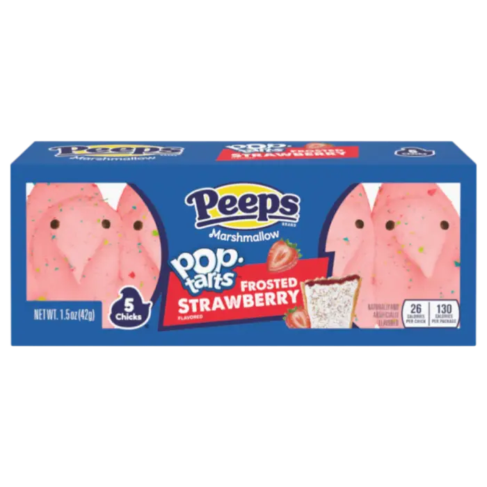 Marshmallow-kyllinger med Pop-Tarts-smak! Peeps Marshmallow Pop-Tarts Frosted Strawberry er de klassiske Peeps-kyllingene med smak av Pop-Tarts Frosted Strawberry. Myke, søte og rosa kyllinger med jordbærglasursmak og strøssel - perfekt kombinasjon av Peeps og Pop-Tarts-smak. Perfekt til påske eller for deg som elsker både Peeps og Pop-Tarts! 🐣🍓