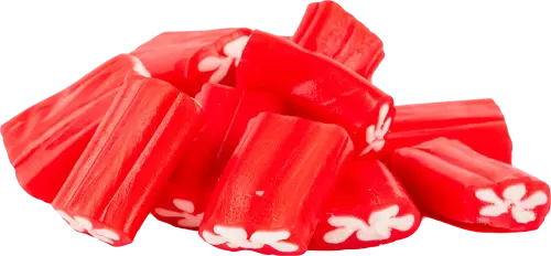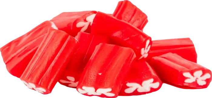 socker, glukos-fruktossirap, VETEmjöl (GLUTEN), stärkelse, gelatin, vegetabiliskt fett (palm, kokosnöt), vegetabilisk olja (palm, kokosnöt), syror: E270, E296, E330, aromämnen, surhetsreglerande medel: E325, E331, salt, emulgeringsmedel: E471, fuktighetsbevarande medel: E422, färgämnen: E120, E160c. Kan innehålla spår av LAKTOS. Näringsinformation: Per 100g. Energi: 1518kJ / 357kcal / Fett: 1.2g / Varav mättat fett: 0.8g / Kolhydrater: 85.0g / Varav sockerarter: 68.0g / Protein: 1.7g / Salt: 0.3g.