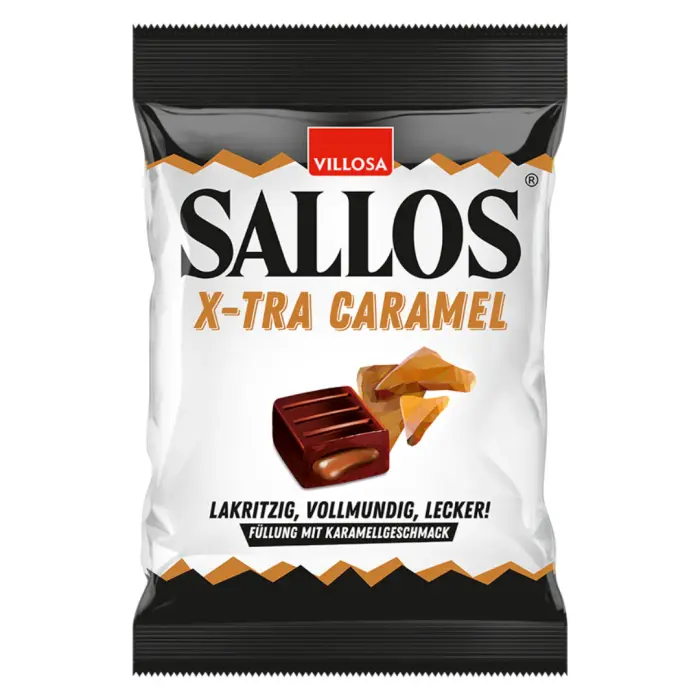 Lakrits med söt överraskning! SALLOS x-tra caramel är för lakritsentusiaster med svaghet för karamell. Kryddig SALLOS-lakrits utanpå, söt karamellfyllning inuti - först kommer kanten, sen karamellen. Utanpå kraftfull, inuti mjuk. Vegansk, gjord med sötrotsaft och individuellt förpackad för dig på språng. För dig som gillar det starkt med söt twist! 🖤🍯