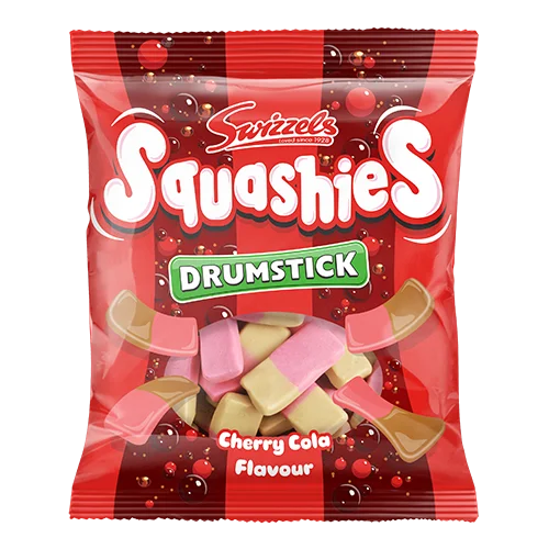 Swizzels Squashies Drumstick Cherry Cola är mjuka, tuggiga godisbitar med smaken av körsbär och cola – en klassisk brittisk godisupplevelse i squashie-format. Söta, syrliga och med den där nostalgiska Drumstick-känslan som aldrig går ur stil. 🍒🥤