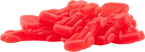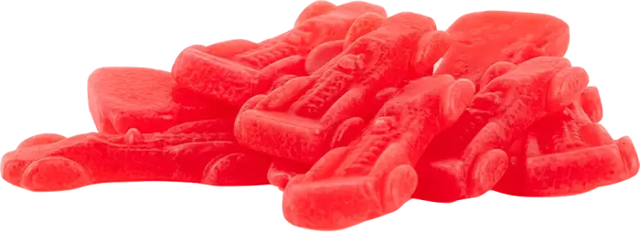 socker, glukossirap, modifierad majsstärkelse, gelatin, aromämne, surhetsreglerande medel (citronsyra), färgämne (E120), vegetabilisk olja (kokos, raps), ytbehandlingsmedel (karnaubavax). Näringsinformation: Per 100g. Energi: 1527kJ / 365kcal / Fett: 0.5g / Varav mättat fett: 0.1g / Kolhydrater: 83g / Varav sockerarter: 72g / Protein: 5.4g / Salt: 0.03g.