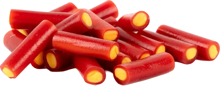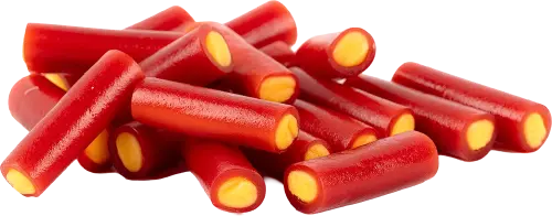 socker, glukos-fruktossirap, VETEmjöl (GLUTEN), modifierad majs- och potatisstärkelse, härdat vegetabiliskt fett (palmkärna, kokos), fuktighetsbevarande medel (glycerol), emulgeringsmedel (mono- och diglycerider av fettsyror), förtjockningsmedel (arabisk gummi), surhetsreglerande medel (äppelsyra), salt, färgämnen (karmin, kurkumin), aromer, vegetabilisk olja (kokos, raps), ytbehandlingsmedel (carnaubavax), antioxidant (askorbinsyra). Näringsinformation: Per 100g. Energi: 1551kJ / 371kcal / Fett: 3.1g / Varav mättat fett: 3.0g / Kolhydrater: 82.0g / Varav sockerarter: 65.0g / Protein: 1.5g / Salt: 0.15g.