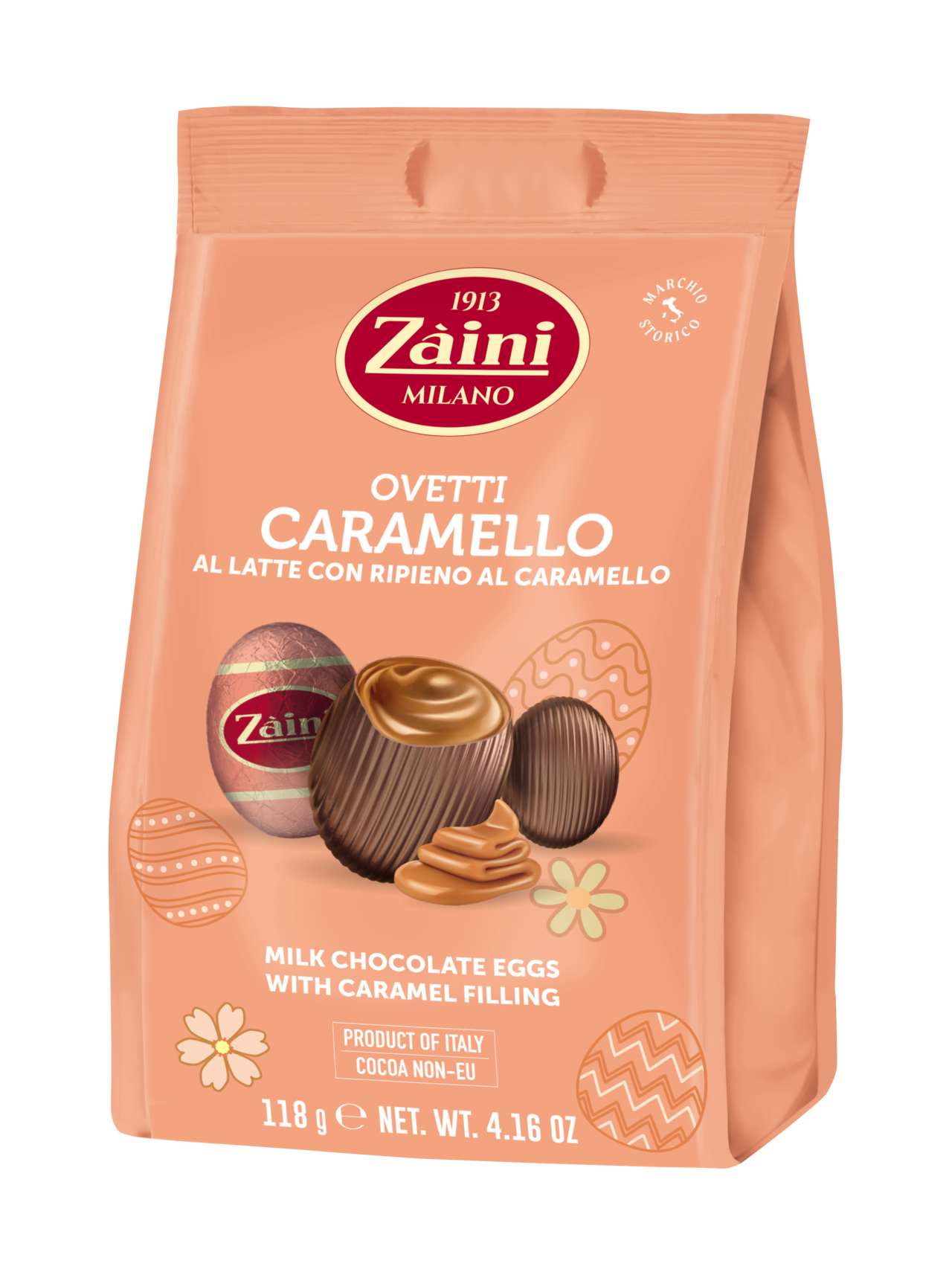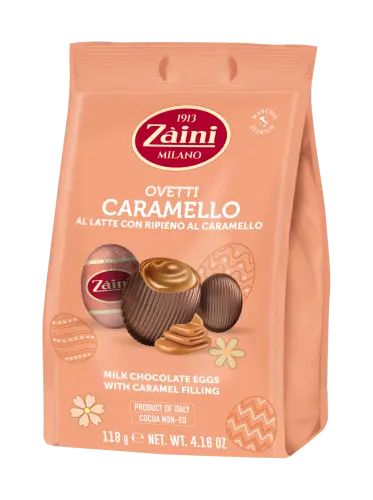 Påskens lenaste goding! Zaini mjölkchokladägg med karamellfyllning är för dig som älskar kombinationen av sött, mjukt och extra lent. Ett krämigt mjölkchokladägg med smält karamell som rinner ut vid första tuggan. Perfekt balans mellan len choklad och söt karamell som förgyller påsken. Perfekt som present eller när du vill unna dig något riktigt lyxigt under påskhelgen! 🥚